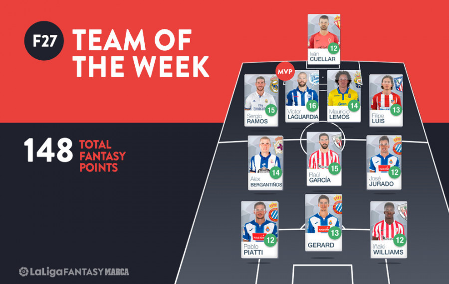 Ivan Cuellar keeps his place as the Best XI custodian, having earned 12 points in the process of helping R. Sporting take a share of the spoils at Mestalla, always a tough place for away teams to play. Ahead of the goalkeeper is a four-man backline consisting of the aforementioned Laguardia, plus Sergio Ramos (15 points), who saved Real Madrid's blushes once again with another crucial goal; Mauricio Lemos (14), who found the net twice in UD Las Palmas's loss to RCD Espanyol; and Filipe Luis (13), who put in an assured performance in Atletico Madrid's tight win at Granada CF.