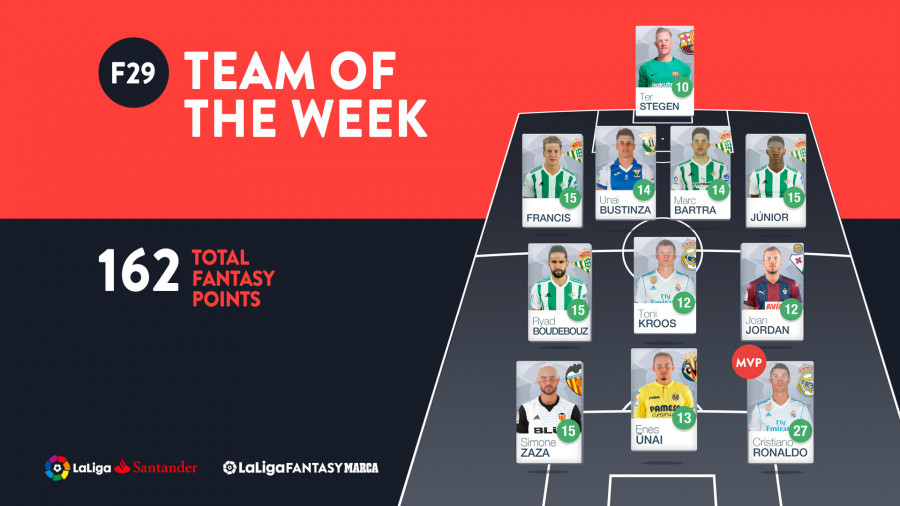 The undoubted star man on this occasion is Real Madrid's Cristiano Ronaldo, who bagged four goals and an assist against Girona FC. The Portuguese forward's extraordinary performance in his side's 6-3 romp at the Santiago Bernabeu secured him 27 points and the Player of the Matchday crown.