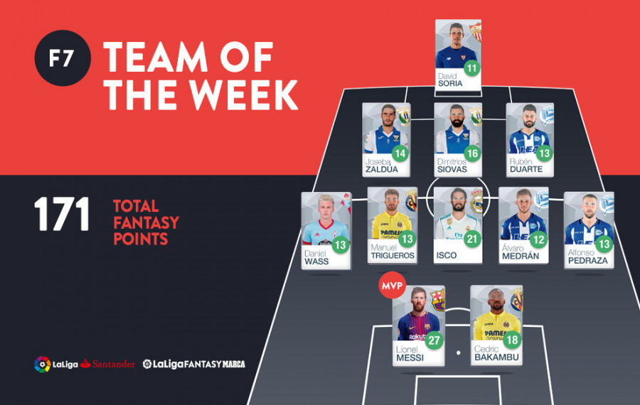 It was a simply unforgettable weekend for D. Alaves, with the Basque side racking up their first win of the campaign, resulting in no fewer than three members of the team featuring in the Best XI, more than any other club. They are joined by representatives from CD Leganes, Sevilla FC, RC Celta, Villarreal CF, Real Madrid and FC Barcelona. The Player of the Matchday from the seventh round of LaLiga Santander fixtures is none other than Lionel Messi. The Argentine scored two of Barcelona's three goals in their comfortable win over UD Las Palmas.
