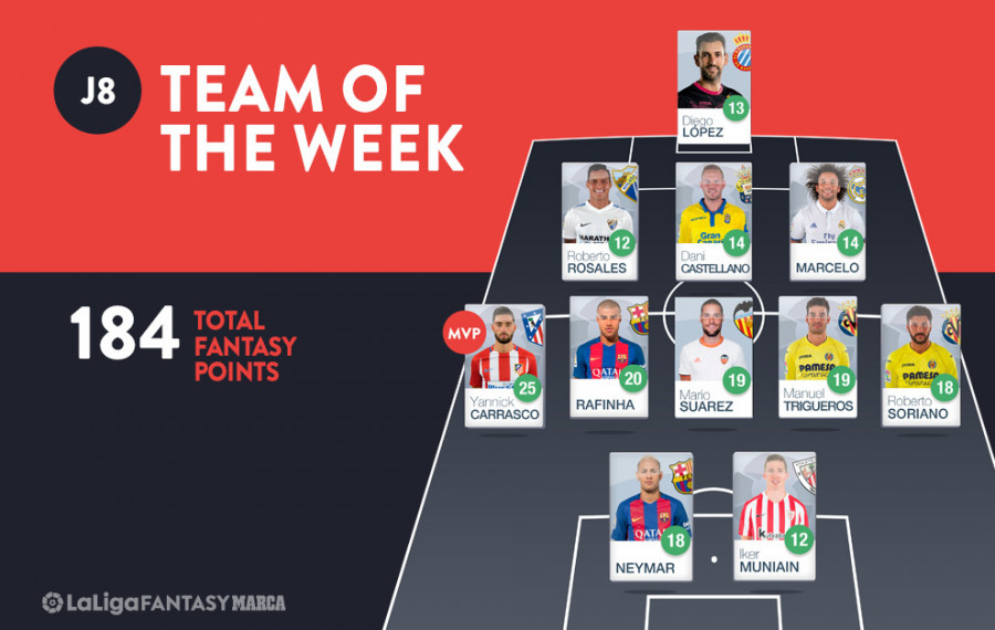 Rosales's strike was arguably the pick of the bunch out of the 13 goals chalked up by members of the Matchday 8 Best XI, of which 10 were notched by midfielders. Besides Carrasco's aforementioned treble, FC Barcelona starlet Rafinha (20 points), Valencia CF's Mario Suarez (19) and Villarreal CF's Roberto Soriano (18) all bagged braces, while the majestic midfield is rounded off by another Villarreal man, Manu Trigueros, who only netted once but outdid teammate Soriano with 19 points.