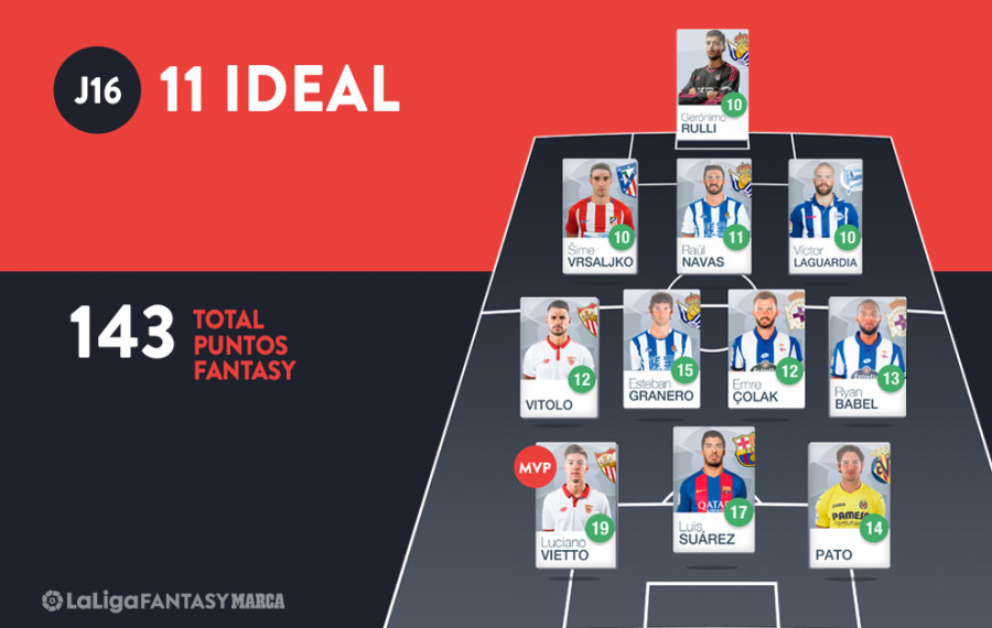La Real Sociedad ha tenido una gran recta final de año y es el equipo más representado en el Once Ideal de la jornada con tres integrantes después de su victoria por 0-2 frente al Granada CF. Sin embargo, el MVP de la jornada 16 es para el jugador del Sevilla FC Luciano Vietto, que marcó dos goles que ayudaron a su equipo a ganar por 4-1 al Málaga CF. Los 19 puntos del delantero le convierten en el jugador más valorado de la jornada.